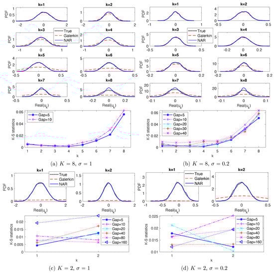 Marginal PDFs and K-S statistics (Kolmogorov--Smirnov statistics, which is the maximum difference between the cumulative distribution functions). In each of (a–d), the top panels are plots of the empirical marginal PDFs of the real parts of the Fourier modes, from data (True), the K-mode Galerkin system (Galerklin) and the NAR models with and with Gap = 5; the bottom panels are the K-S statistics of NAR models with different time steps , up to the largest Gap such that the NAR model is numerically stable.