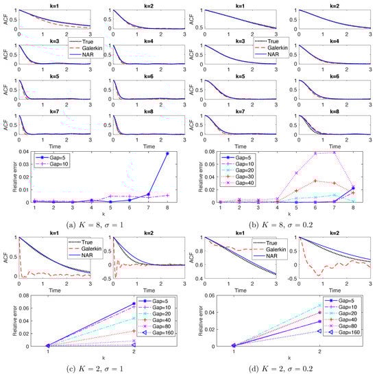 ACF (auto correlation functions. In each of (a–d), the top panels are the ACFs of the real parts of the Fourier modes when Gap = 5; the bottom panels are the relative errors (in -norm) of the NAR models with different time steps , up to the largest Gap such that the NAR model is numerically stable.