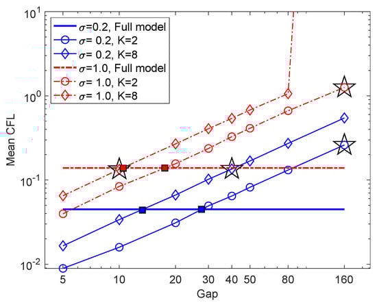 The mean CFL numbers of the full models and the K-mode Galerkin systems. The mean CFL number is computed along a trajectory with steps. The time step is for the full model, and is for the K-mode Galerkin system. When , the K-mode Galerkin system blows up after , so its CFL number is missing afterwards. The stars are the maximal , such that the NAR model is stable. The red and blue squares are where the full model’s mean CFL numbers agree with those of the K-mode Galerkin systems. The stars (✩) are the largest time Gap that our NAR model is numerically stable. The relative errors in energy spectrum in Figure 4c,d are the smallest when the ’s are the closest to these squares.
