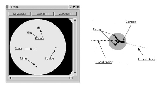 Two types of objects appear at random in the arena in the course of battle: mines and cookies. If a robot collides with a mine, it loses an amount of energy similar to receiving a shot, while a cookie provides energy when it is collected. Both types of object (cookies and mines) disappear after collision. A robot that collides with arena walls or rival robots loses less energy than when colliding with a mine. In a collision, robots rebound.