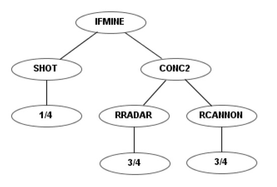 Figure 10 shows the behavior tree of an example robot that is programmed under the third instruction set, as in Figure 4 and Figure 6, to destroy the mines. It rotates the radar at maximum speed, but fires with only half power. The node indicates that the radar rotates clockwise.