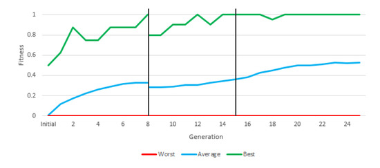 Figure 13 depicts the evolution of fitness through the two stages of the experiment. The most relevant information is the average fitness, since there may be individuals who reach the maximum fitness in an experiment without constituting a valid solution, and there will always be an individual with the minimum fitness in each generation.