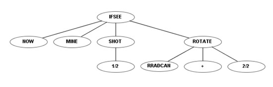 This instruction set was based on the first. We made it more modular by creating instructions like “ifsee” to replace “ifmine”, “ifshoot”, etc. The “ifsee” instructions have a new terminal that can be “mine,” “robot”, “shot”, “cookie”, “wall”. If, for example, a user has a robot that shoots if it sees a mine, a child of this robot easily can “inherit” a simple mutation of this behavior and shoot if it sees a robot—see the examples of mutation (Figure 8) and crossover (Figure 9).