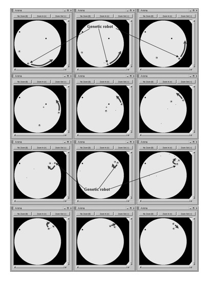 A major difficulty of this sort of experimentation is the computational cost involved. Although combat was performed in parallel (15 bouts at a time), these experiments still required 1043 CPU hours. To manage these computational costs we made two important decisions. First, we limited the number of runs of each experiment to one. Although this prevents us from making a detailed statistical analysis of the results, we consider that the experiments still demonstrate that interesting and effective behaviors can be found by evolutionary means. We are considering to apply new techniques for reduce the computational cost, such us microfluidic based devices [37,38]. Second, due to these costs, we did not explore the possibility of adopting co-evolutionary approaches, with evolved robots battling each other. Such experiments could further improve the results and increase their generalization abilities, since the robots would be fighting evolving adversaries and, therefore, would not be able to find shortcuts that yield good results against a specific bot but that are not generalizable. We plan to explore this line of research in the future.