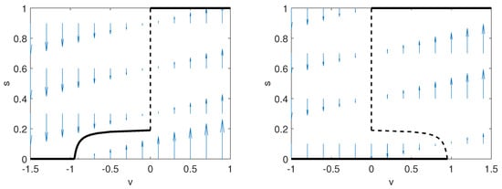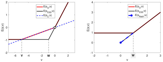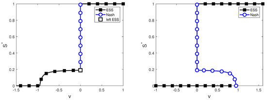 Nash and evolutionarily stable information search strategies s, depending on the information search values v. On the (left), a negative impact measure is considered, and on the (right), a positive impact measure is considered. The blue line corresponds to Nash equilibria (that are not ESI strategies), and the black line corresponds to evolutionarily stable information (ESI) search strategies. Other parameter values: , , and .