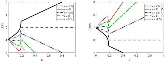 The expected information search payoff , depending on the value of the information search v for different search strategies s: critical search strategy , OI search strategy , ESI search strategy , and Nash strategy . On the (left), a negative impact measure is considered, and on the (right), a positive impact measure is considered. The other parameter values are and . Hence, and (left) or (right).