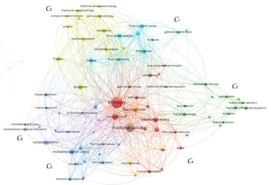 To unravel the main areas of application of the fractional entropies, we use the VOSviewer (https://www.vosviewer.com/), which allows the construction and visualization of bibliometric networks []. The bibliometric data of the 170 papers that cite the nine papers that present the fractional-order entropies were collected from Scopus for constructing Table 2, and are the input information to the VOSviewer. The co-occurrence of the authors’ keywords in the 170 papers is analyzed, with the minimum value of co-occurrence of each keyword set to 3. Figure 4 depicts the generated map. We verify the emergence of six clusters, . At the top, the light-blue cluster, , includes the fields of finance and finance time series analysis, while the light-green one, , encompasses a variety of areas, such as solvents, fractals, commerce, and stochastic systems, tightly connected to some entropy-based complexity measures. On the right, the dark-green cluster, , includes the areas of fault detection and image processing. At the bottom of the map, the red cluster, , highlights the fields of chromosome and DNA analysis, while the dark-blue, , one emphasizes some clustering and visualization techniques, as multidimensional scaling and hierarchical clustering. On the left, the magenta cluster, , includes keywords not related with applications.