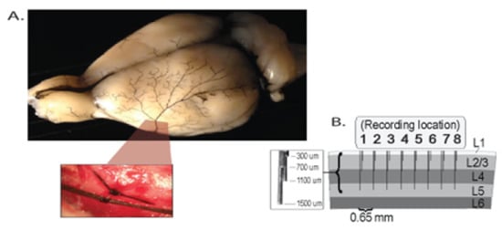 (A) Visual representation of the 32 microelectrodes on the rat’s cortex from which the local field potential (LFP) signal is recorded. (B) The distance between microelectrodes is 0.65 mm and the total distance between microelectrode 1 and microelectrode 8 is 3.9 mm.