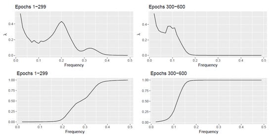 We consider a discretized set of frequency points of the interval . At each point we evaluate the average of the scan statistic over epochs 1-299 and the average of the scan statistic over epochs 300–600. More precisely at each frequency point and at each epoch, we obtain and compute averages of these quantities over the respective epochs. In the top panel of Figure 2 we plot this average scan statistic. For epochs 1–299, from (7) is a combination of two AR(2) processes with spectral density peaks at roughly 0.22 and 0.33. The top left plot in Figure 2 witnesses the scan statistic exhibiting bumps around those frequencies. Similarly for epochs 300–600, from (7) is generated from an AR(2) process with peak at roughly 0.12. The top right plot in Figure 2 witnesses the scan statistic exhibiting a bump around that frequency.