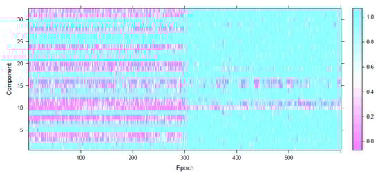 The evolutionary dimension of the latent stationary sources were presented in Figure 4. The plot indicates increase in the number of stationary sources in post-stroke epochs (after epoch 300) and this agrees with the results in Figure 3 wherein more epochs after the stroke witness stationary behavior in the individual LFP components. It is indeed interesting that immediately post-occlusion (or immediately after stroke onset), the LFPs are highly synchronized: the plots of the observed LFP and the estimated squared coherence between the 32 components (Figure 5) suggest that different electrodes look very similar and there is high coherence in between the entire network of electrodes at various frequency bands. Please note that for the observed 32 dimensional signal in epoch i, the squared coherence between two components and , for , at frequency is given by