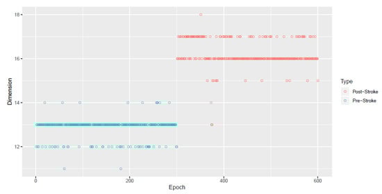 Plot of estimated stationary subspace dimensions for the epochs in the stroke experiment. Please note that for each epoch i there is a single estimated dimension that is plotted.