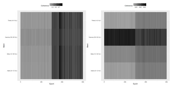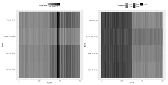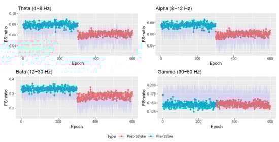 Table 1 and Table 2 contain numerical summaries of the FS-ratio statistic for the pre and post stroke epochs at various frequency bands. We notice that the Beta band is where there is maximum difference observed between the pre and post stroke epochs. The Gamma band is consistent throughout the experiment’s 600 epochs. Within the pre stroke epochs (and also within the post-stroke epochs), the most variation in FS-ratio is observed in the Beta band.