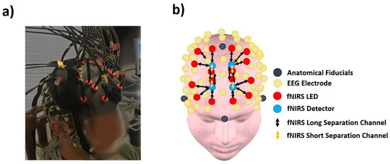 (a) Electroencephalography (EEG)-fNIRS (functional Near Infrared Spectroscopy) probes placed onto an indicative participant head. The fNIRS optodes were in contact with the scalp exploiting the space among the electrodes of the EEG cap. (b) EEG-fNIRS probes projected onto a template head. The high-density EEG layout was in agreement with the 10/20 system, and the fNIRS probes were positioned with reference to the EEG electrodes.