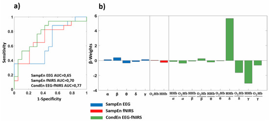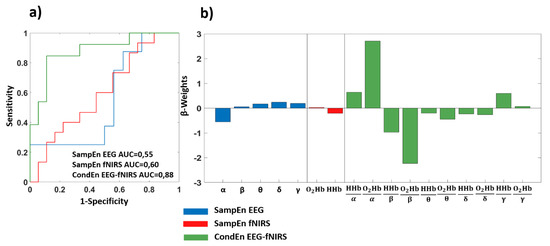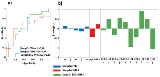 Figure 4 reports the results of the data-driven procedure applied to RPM. Figure 4a reports the ROC curve associated to the leave-one-out cross-validated output of the machine learning framework, whereas Figure 4b shows the β-weights associated to each regressor. Using the SampEn EEG metrics, an AUC of 0.48 was obtained. Employing the fNIRS complexity metrics, an AUC of 0.67 was delivered, and selecting a threshold of 0.54 on output of the multivariate analysis, a sensitivity of 0.65 and a specificity of 0.74 were obtained. The ROC curve associated to the CondEn EEG-fNIRS exhibited an AUC of 0.69, and using a threshold of 0.42, a sensitivity of 0.71 and a specificity of 0.58 were reached.
