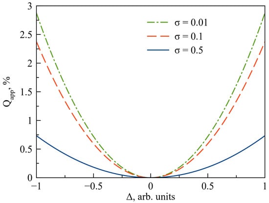 Taking into account all the previous reasoning, one may derive a final expression for QBER (that is the ratio of undesirable detection events when the phase difference equals to the total amount of detection events; detection events rates are proportional to optical power of the signal in Mandel linear approximation [], that can be applied taking into account and additioanl losses):