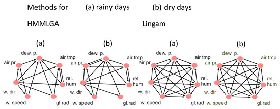 Based on the expert knowledge [37], the temporal interactions in HMMLGA output graphs in both the rainy and dry scenarios correspond to the reality. In , which is the subgraph of HMMLGA of connections of the complement for dry days and of rainy days, the following directed edges in the form (cause, effect) were detected: (air tmp, air pr) and (dew p, air pr). The (direct) influence of dew point on air pressure is more strongly observable during sunny days, since the dew point is not possible to determine during rainy days. Similarly, the causal influence of air temperature on the air pressure is stronger during sunny days than during rainy days. So, both detected edges in HMMLGA were realistic. was empty. Output graph gave no edges. For , we obtained these directed edges: (dew p, air pr), which is, during rain, not observable, but the achieved influence (rel hum, dew p) is also during rain observable. Moreover, (rel hum, air pr) are observable (as humidity increases, pressure decreases). The edge (w speed, w dir) is not observable in reality, (w speed, air pr) is observable (higher wind speeds will show lower air pressure); also (w speed, air tmp) and (w speed, gl rad) are observable, however direct effect (w dir, rel hum) is not observable in reality. So, had 2 falsely detected directions out of 8. Graph gave this edge (dew p, air pr). Similarly, as in the case of HGGM, this edge is, during rain, not observable; (dew p, air tmp)—is during rain not observable; (dew p, w speed)—is during rain not observable; (dew p, rel hum)—is during rain not observable; (dew p, gl rad)—is during rain not observable; (rel hum, gl rad)—is during rain observable; (gl rad, w speed)—is during rain not observable; (gl rad, w dir)—is during rain not observable. So, had 7 falsely detected directions out of 8. The output of gave these edges: (rel hum, dew p)—this is during a dry period observable; (rel hum, air tmp)—this is during a dry period observable; (gl rad, w speed)—this is during a dry period observable; (dev p, air tmp)—this is during a dry period observable; (air press, w dir)—this is during a dry period observable; (w speed, air pr)—this is during a dry period observable; (air pr, w speed) is during dry period in reality observable. So, had 7 correctly detected directions out of 7.