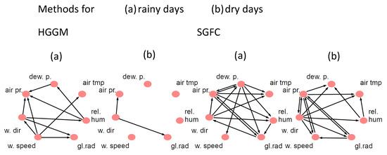 The resulting output graphs for methods HMMLGA, Lingam and HGGM for rainy and dry days gave the same graphs each for both lags; for dry days, we obtained, in HGGM, different graphs for each lag. We were interested in (a) how realistic were the detected temporal interactions of the processes by each method and in each scenario and (b) how realistic were the detected temporal interactions by each method, coming from the difference of graphs for dry and rainy days. In this case, we focused here only on the connections which differed in both graphs for each method. The figures of the output graphs for methods HMMLGA, Lingam, SFGC and HGGM for rainy and dry days can be for lag , seen in Figure 1 and Figure 2.