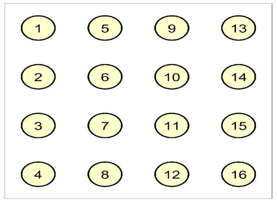 We considered a database of 4-by-4 electrode EHG recordings performed on pregnant women, which were recorded in Iceland between 2008 and 2010 and are available via PhysioNet (PhysioBank ATM) [39]. This EHC grid (in the matrix form) was placed on the abdomen of the pregnant women. The electrode numbering, as considered in [38], can be found in Figure 3.