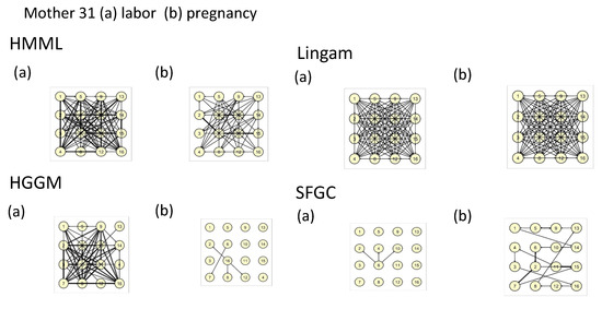 Since HMMLGA had higher F-measure than exHMML in the synthetic experiments with 16 Poisson time series, we considered further only HMMLGA in this real data experiment. In the synthetic experiments in [12], Poisson time series showed the highest F-measure on short time series, i.e., the case when the number of time observations is smaller than approximately two orders times the number of time series. Based on this, we took the last 1200 observations for labor, since in the last phase, it was sure the labor had already started and the contractions had increased in time. Labor still continued for another few hours after the EHG recording finished for each of five women. For pregnancy time series, we took also 1200 observations, starting the moment where all electrodes had been fixed. The hypothesis, that during labor all electrodes were activated was confirmed by HMMLGA, HGGM and Lingam at all mothers. The hypothesis, that the causal graph during labor had higher density of causal connections than in the pregnancy case, was confirmed at all mothers by HMMLGA, for HGGM for mothers 30 and 31, but for SFGC and Lingam, we could not confirm it. In fact, Lingam gave identical complete causal graphs for both labor and pregnancy cases. The real computational time for Lingam (with 100 boots, as recommended by the authors) was for 16 time series and both labor and pregnancy modalities cca 12 h (in HP Elite Notebook); on the other side, for other methods, the time was in order of minutes. We present the causal graphs of all methods for labor and pregnant phase of mother 31 in Figure 4.