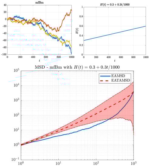 MFBM with the linear Hurst exponent function. Top left panel: three simulated trajectories. Top right panel: illustration of the function used in simulations. Bottom panel: comparison of EAMSD (solid blue line) with EATAMSD (dashed red line) and its 95% confidence interval (red shaded area). EAMSD and ETAMSD with confidence interval were calculated on the basis of 1000 simulated trajectories of MFBM.