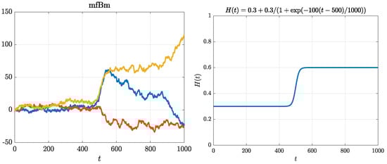 FBM has stationary increments that do not allow us to model processes whose regularity of paths and “memory depth” change in time []. Several generalizations of FBM have been proposed recently. One of these, called multifractional Brownian motion (MFBM), was proposed by Peltier and Véhel [] with time-varying Hurst exponent which is a Hölder function. The variance at time t of the MFBM is given by []. The time-varying Hurst exponent characterizes the path regularity of the process at time t: sample paths near t with small , close to 0, are space-filling and highly irregular, while paths with large , close to 1, are very smooth. The variance constant determines the “energy level” of the process. This natural extension of FBM results in some loss of some of FBMs basic properties, in particular, the increments of MFBM are non-stationary and the process is no longer self-similar.
