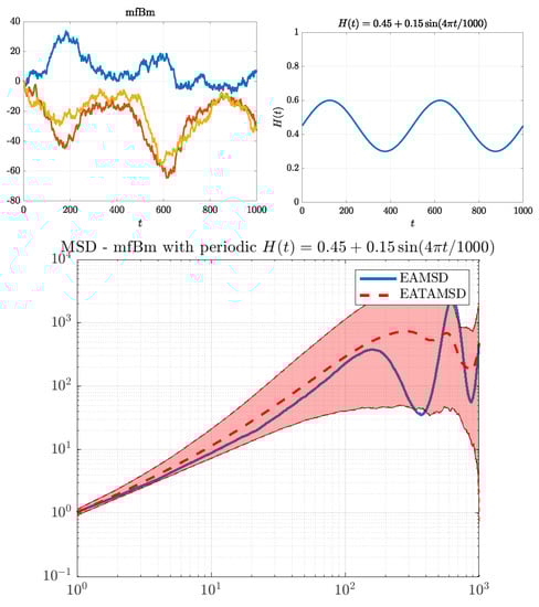 MFBM with the periodic Hurst exponent function function. Top left panel: three simulated trajectories. Top right panel: illustration of the function used in simulations. Bottom panel: comparison of EAMSD (solid blue line) with EATAMSD (dashed red line) and its 95% confidence interval (red shaded area). EAMSD and ETAMSD with confidence interval were calculated on the basis of 1000 simulated trajectories of MFBM.