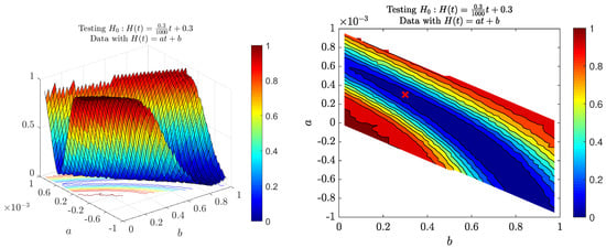 First, let us consider testing MFBM with the linear Hurst exponent function. We can see the power function related to that case in Figure 4. The left panel presents the power function with respect to parameters a and b from the alternative hypothesis , the right panel the corresponding heat map. We can see “layers” (regions on the heat map with the same color) for which our test has a very similar power. For example, the deep blue region on the right panel corresponds to the processes indistinguishable from the null hypothesis process. We believe that the shape of the region is related to the construction of our test, namely our test statistic takes into account all addends with the same weight, thus it is not that relevant whether t is big or not. In the case of MFBM, for which neither the process nor its increments are stationary, it might be an important factor. As a consequence, we can see that the test has a difficulty in distinguishing between MFBMs with increasing and decreasing Hurst exponent functions if their means are similar. However, this conjecture is not very precise, namely the mean case , which matches the alternative hypothesis with , yields a much higher power of the test than the significance level. We also note that for parameters from the null hypothesis: power of such test is approximately equal to , which is the assumed significance level. On the heat map, white regions represent areas for which the process MFBM is not well-defined, i.e., for some .