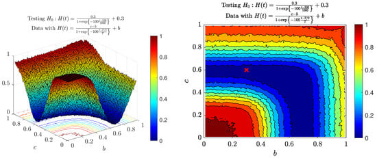 Let us now consider the second case, that is MFBM with the logistic function . We can observe the power function in Figure 5. Left panel presents the power function with respect to parameters b and c from the alternative hypothesis , the right panel the corresponding heat map. The parameter b is related to the local self-similarity parameter for , and c for . Similarly to the case with the linear function null hypothesis, here we can observe “layers” in which parameters b and c are almost symmetric (e.g., the null hypothesis case where and is closely related to the case and ). Moreover, we can see that the power function seems to be quite high in the cases when a tested sample has the b parameter close to the value from the null hypothesis, but c is far from 0.6, or vice versa.