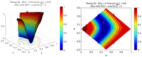 Power of the introduced test for the periodic Hurst exponent function with respect to parameters a and b. The null hypothesis is and . The right panel depicts the results in the form of heat map with the red ‘x’ sign representing parameters in the null hypothesis. White regions represent areas for which MFBM is not well defined. The powers were calculated by means of Monte Carlo simulations on the basic of simulated data from the MFBM with different as and bs.