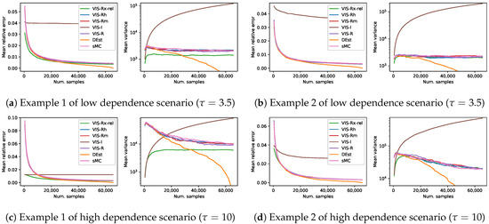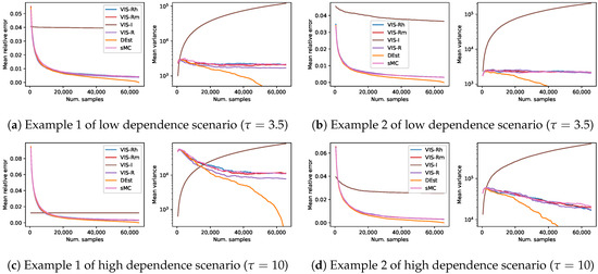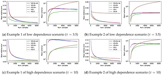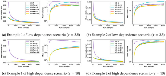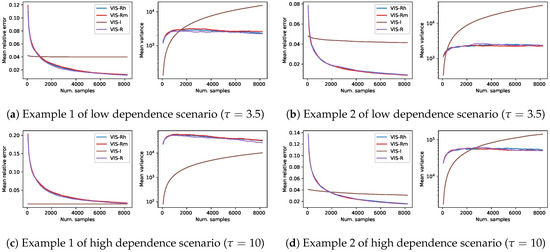 The performance of VIS-Rx was similar for all the values of . Starting from a minimum variance point, which, as observed above, was established by the I-projection, the empirical variance quickly rose to then reduce the slope and continued increasing more softly. However, smaller values of led to reduced empirical variance. Specifically, the approach which used an value which depended on the number of samples (the larger the sample, the smaller the proportion of I-projection points) showed consistently the best results. The behavior of VIS-R was noticeably different, starting from a larger variance and relative error points. In the case of empirical variance, after a considerable increase, it steadily decreased.