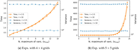 Finally, we explore the performance of our approximate approach VIS-Rh when different values for the parameter are considered. Note that as the value of tended to the number of variables of the model, , our approximation resembled the exact VIS-R. On the other extreme scenario, when only the unary factor for each specific variable was considered every time (no dependence can be captured). In Figure 2 we compare different possible values for in tests with both and Ising Grid models. It can be seen that the time required for projection was exponential on the values, and the empirical variance showed an almost imperceptible downwards trend.