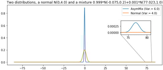 Distributions considered in the simple variance analysis. A normal distribution with variance 4 and a mixture of larger variance (6) with a large component (, centered in −0.07, with variance ) and a small component with a huge contribution to variance (, centered in 77.02, with variance 1).