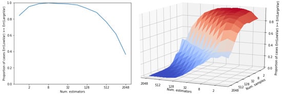 Proportion of cases (over 1000 repetitions) where the mean square error of the estimator using the lower variance distribution (normal distribution in Figure 4) is larger than that of the one using the larger variance distribution (mixture in Figure 4). On the left, the proportion for different number of estimators (a single data point sampled per estimator). On the right, the same proportion for different number of estimators and samples per estimator.