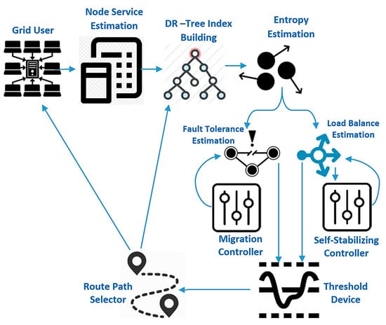 Figure 1 shows the complete proposed model for improving fault tolerance and load balance based on the fractal transform. The first step is to estimate grid computing service (GCS) parameters, including cost, job queue, task schedule, cluster size, grid size, and the number of resources, then mapping this grid structure into a distributed R-tree index structure enhanced by the entropy method to reduce the completion time of the decision-maker. Finally, the threshold machine is used to choose the route path based on load balance as well as the fault tolerance device. The migrant controller is used to increase fault tolerance and self-stabilizing control is used to increase cumulative state load balancing. Each consumer submits their computational and hardware specifications to the GCS. The GCS can respond by submitting the results when the job execution is done.