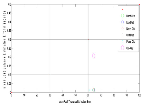 Observation: Figure 6 shows the relationship between grid size and the arrival rates for different random distributions, such as random (Rand-Dist), exponential (Exp-Dist), normal (Norm-Dist), uniform (Unif-Dist), and Poisson (Poiss-Dist). The results reveal that for different arrival rates, the Poisson distribution yields a minimum grid size as compared with other distributions. It has an improvement ratio of about 4.6%. Furthermore, Figure 7 shows a 2-D figure of merits that depicts the relationship between mean load balance estimation error and mean fault tolerance estimation error. It can be inferred that the Poisson distribution gives the best stability system compared to all different distributions and the job response time algorithm. As shown in Figure 7, given the best result for the Poisson distribution, the load balance is still the same, and this confirms the stability condition of the DR-tree model. The next step tries to enhance load balance, and the fault tolerance of the suggested model depends on different entropy values.