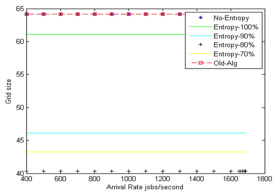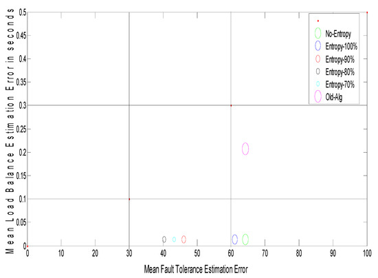Figure 8 shows the grid size at different arrival rates for the Poisson distribution with different entropy threshold values; the improvement ratio for fault tolerance in terms of grid size is 33% at an entropy value of 80%. Figure 9 shows the system stability in terms of load balance and fault tolerance estimation errors after enhancement. The results reveal that when decreasing the entropy threshold value ε to less than 80%, the stability of the system decreases. The suggested model yields an improvement ratio of 98% for load balance and 33% for fault tolerance as compared with initial conditions.