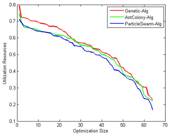 Observation: The results shown in Figure 10, Figure 11 and Figure 12 reveal that as the number of iterations increases, the value increases for GA, ACO, and PSO, respectively. The increasing of the curve tends to become stable approximately after the 8th iteration for both PSO and ACO, while GA reaches stability at the final iteration to obtain an optimal value. It can also be observed that the PSO optimization technique yields the best value as it reaches a stable value faster than ACO. Figure 13 shows the system utilization resources as a function of optimal size (number of iterations for each optimization technique). As the optimization size increases, the system utilization decreases. When comparing the three optimization algorithms with respect to system utilization, the results confirm that they almost give the same results (about 75%) but it could be shown that the PSO algorithm gives the best performance.