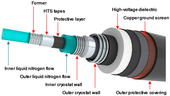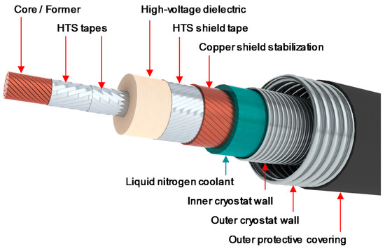 The cable assembly is placed into a cryogenic envelope with low thermal losses, which maintains the adequate cryogenic operating temperature and prevents thermal exchanges with the surrounding environment. Figure 3 and Figure 4 show the two cable designs for the HVDC cable system. The proposed designs are versatile, allowing for different nominal currents and, therefore, different transmission capacities without an increase in size.