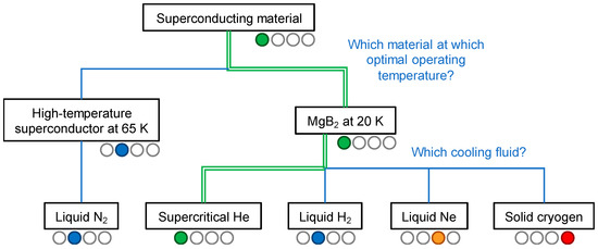 Decision tree on the selection of the superconducting material and associated cooling medium. The color code used here is as follows: green for the selection made in Best Paths, blue for other available alternatives, orange for unsuitable alternatives, and red for alternatives currently no available.