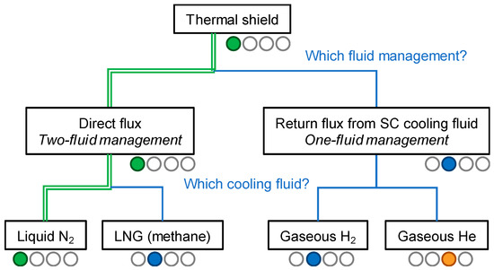 Several cryogenic fluids are possible candidates for a thermal shield between 60 and 100 K. Ideally, they should be cheap, abundant, and either liquid or gaseous. As presented in the tree of Figure 6, two concepts have been envisioned. The first one introduces an additional cryogenic fluid, whereas the second one benefits from the return flux of the cooling medium used for the superconducting cable.