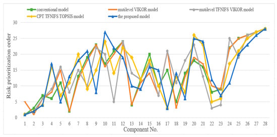 To verify the efficiency of the extended FMEA model, a comparison study is performed with other approaches based on the example mentioned above. The extended FMEA model based on cumulative prospect theory and type-2 intuitionistic fuzzy VIKOR approach has been proposed to improve the accuracy of conventional FMEA by considering the uncertainty, experts’ risk sensitiveness and decision-making psychological behavior. As a result, the conventional FMEA model (conventional model), the multilevel FMEA based on VIKOR model (multilevel VIKOR model), multilevel FMEA with TFNIFS VIKOR model (multilevel TFNIFS VIKOR model) and FMEA with cumulative prospect theory, TFNIFS and TOPSIS model (CPT TFNIFS TOPSIS model) are selected for comparison study to find out the advantages of the proposed FMEA model. The risk prioritization outcomes of the illustrative models are represented in Figure 3.