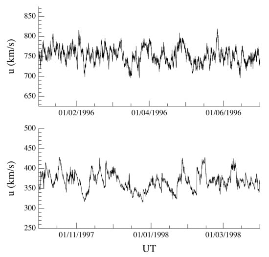 - (ii) an already investigated long-standing period of nearly constant slow solar wind conditions ( km/s) from 01 October 1997 to 31 March 1998 (labeled as ), when the Ulysses satellite was on the heliospheric equatorial plane (HGI Lat ) at a distance of ∼5 A.U. (see, e.g., [,]).
