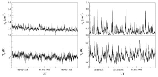 The used dataset of plasma experiment on-board the Ulysses satellites provides two different estimates  and  of the proton temperature. These two estimates can be considered as an upper and lower estimate of the real proton temperature; . As already observed in [] for the low-latitude period, the two temperatures display the same statistical behavior also in the case of the high-latitude time interval considered here. Thus, we will consider the mean value between the two as a reliable estimate of the true proton temperature T. Furthermore, the average proton temperature is  K, and  K for the high-latitude fast solar wind period and the low-latitude slow solar wind one, respectively. These average proton temperatures agree with previous observations of fast and slow solar wind conditions [,].