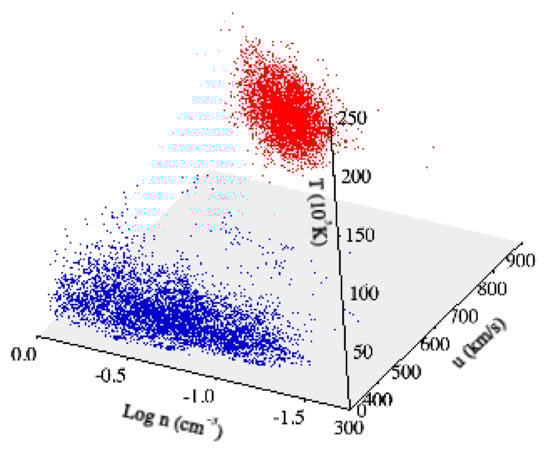 Scatter-plot of the two datasets in the 3D space . Blue and red dots refer to slow and fast solar wind, respectively.