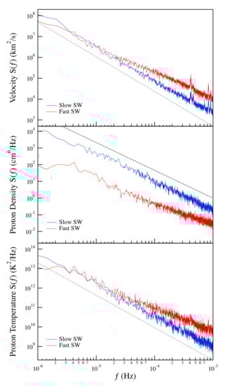 The observed spectral features shows the occurrence of clear frequency domains characterized by a power-law behavior of the spectral density, . In particular, in the case of slow solar wind, the observed spectral exponent for all the quantities under investigation is very well in agreement with the expected behavior from the KOC theory [,], which predicts an exponent . Differently, the spectral density for the fast solar wind is less steep, showing a spectral exponent .