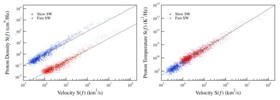 As shown in Figure 5, in spite of the different spectral features between the slow and fast solar wind periods, we observe a linear dependence of the proton density and temperature spectra with respect to the velocity one (). This linear dependence is very good in the case of the proton temperature extending over more than three orders of magnitude. Conversely, some slight discrepancies are observed in the case of the proton density especially in the case of the slow solar wind period. The observed small discrepancy could be due to an anomalous scaling, which in the case of passive quantities is more pronounced and could imply a different intermittency correction to the spectral exponent [,]. The quasi-linear dependence of the spectra of the proton density and temperature on the velocity spectra support the hypothesis that these quantities could behave as scalars passively advected by the solar wind.