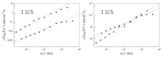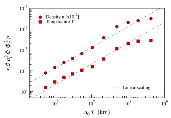 On the other hand, in the case of fast solar wind, the situation is less clear. Indeed, in this case, although we find scaling features of the proton density and temperature third-order scalar-mixed structure functions, the observed scaling properties do not agree with the predictions of Yaglom’s law, which is usually recovered in ordinary fluid flows. Although we found that the same relation is recovered in slow solar wind data, where a Kolmogorov phenomenology is at work, in MHD, a different regime can be found, as described a long time ago [,]. In fact, in MHD, when the magnetic effects are dominant, the nonlinear interactions are slowed down by the sweeping effect of fluctuations on the background magnetic field, namely nonlinear interactions happen between fluctuations propagating in the opposite direction with respect to the magnetic field, and the sweeping acts to modify the interaction time. This gives rise to the Kraichnan phenomenology of MHD turbulence [], which predicts a scaling for Elsässer fluctuations  (Elsässer variables are defined as , where  is the plasma velocity,  is the magnetic field, and  is the plasma density), thus recovering the Kraichnan spectrum for pseudo-energies .
