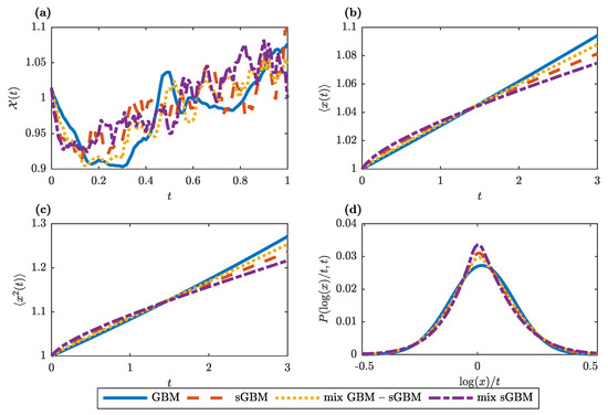 Evidently, in GBM, the diffusion coefficient scales proportionally with the square of the position of the particle, i.e., , and, thus, the MSD has an exponential dependence on time. A more convenient measure instead of the MSD for geometric processes is the behaviour of the expectation of the logarithm of , which, in asset pricing terms, represents the continuously compounded return of the asset. In the case of GBM, the expectation of the logarithm of the particle position has a linear dependence on time. This can be shown by calculation of the log-moments , see Appendix A, Equation (A7). The mean value of the logarithm of becomes