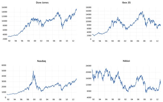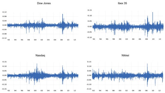Many scholars have empirically studied the existence of nonlinear dynamics in financial series [4], meanwhile several theoretical models consistent with the presence of nonlinearity in asset prices have arisen [5]. The nonlinear approach can capture the characteristics of the financial series and their sudden fluctuations, and, therefore, plays an important role in economic modeling [6,7]. The initial interest in the application of nonlinear models has been extended to solve the question of whether the nonlinear dynamics have a stochastic or deterministic behavior. This issue constitutes a key point in the process of modeling and forecasting financial time series. The emergence of new models that deal with the volatility present in financial time series, such as the autoregressive conditional heteroskedasticity ARCH [8], generalized (GARCH) [9] and exponential GARCH (EGARCH) [10] models, in consonance with the development of the chaos theory that can explain the effect of shocks on the stock markets as part of the endogenous dynamics of the series itself, constitute a fundamental contribution to solving this issue.