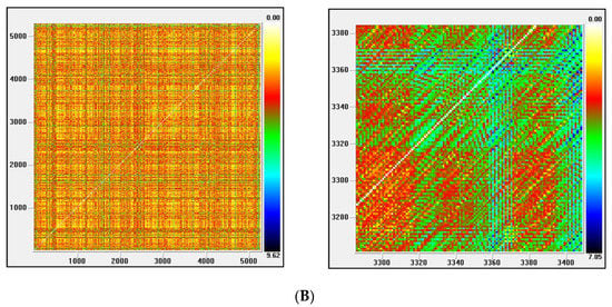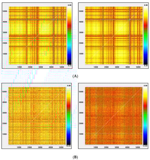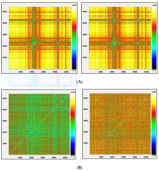 (A) Recurrence plot for the returns and ARMA series from the Nasdaq index; (B) Recurrence plot for the GARCH and EGARCH series from the Nasdaq Index.